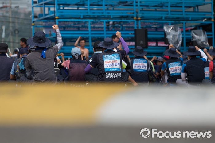(아산=포커스뉴스) 1일 오전 충남 아산 탕정면 갑을오토텍에서 노조원들이 사측의 경비 용역 투입에 대비하고 있다.