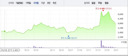 초록뱀은 2일 오전 9시47분 현재 전 거래일 대비 4.27%(175원) 하락한 3925원에 거래되고 있다. 초록뱀은 7월25일에서 27일까지 2~3%의 상승폭을 기록했지만 7월28일부터 이달 1일까지 2~8%의 낙폭을 나타냈다.
