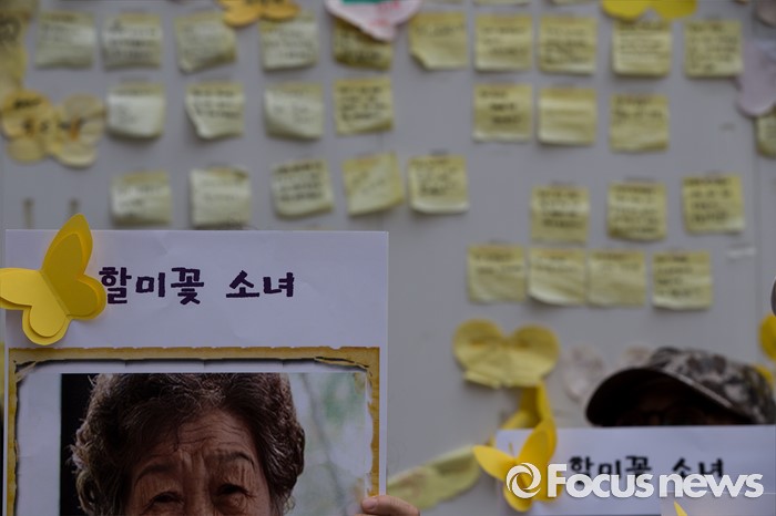 (서울=포커스뉴스) 3일 오후 서울 종로구 구 일본대사관 앞에서 열린 '제1242차 일본군 위안부 문제해결을 위한 정기 수요집회'에 참석한 시민들이 위안부 피해자 손 피켓을 들고 있다.