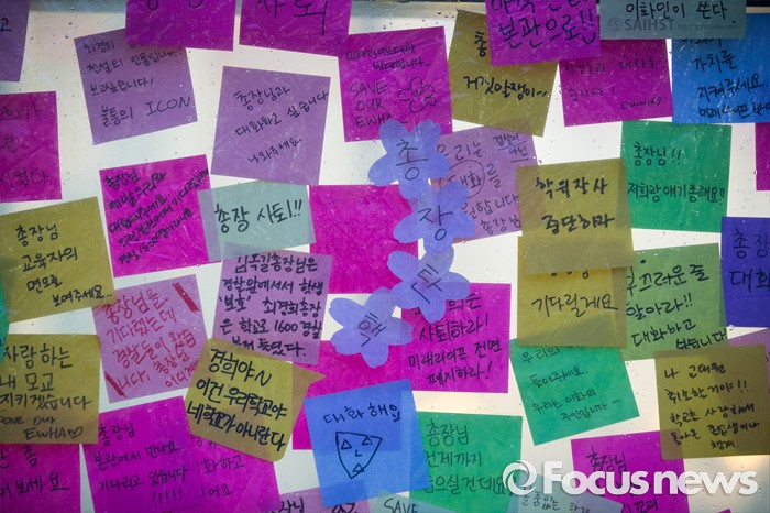 (서울=포커스뉴스) 미래라이프 대학 설립에 반대하는 학생들이 엿새째 이화여대 본관을 점거하고 있는 2일 밤, 서울 서대문구 이화여대 교내에 다양한 목소리의 시위성 글들이 붙어 있다.