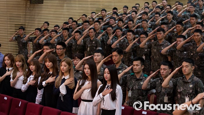 (서울=포커스뉴스) 2일 오전 서울 용산구 국방부에서 열린 '군인 금연 홍보 엔젤스 위촉식'에서 금연 홍보대사로 위촉된 그룹 러블리즈가 국민의례를 하고 있다.