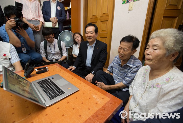 (서울=포커스뉴스) 정세균 국회의장이 2일 오전 서울 종로구 창신동에 거주하고 있는 고령 이산가족 김문각 할아버지(84세, 평안남도 양덕군 청계리) 가정을 방문해 김 할아버지와 이오례 할머니가 제작한 영상편지를 시청하고 있다.