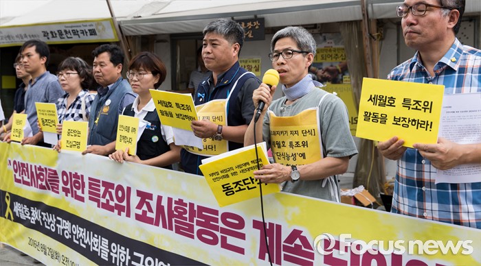 (서울=포커스뉴스) 2일 오전 서울 종로구 광화문광장에서 지하철 비정규직 사망재해 해결과 안전사회를 위한 시민대책위원회가 세월호 특조위 동조단식 돌입 기자회견을 하고 있다.