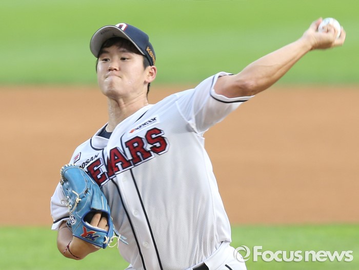 (서울=포커스뉴스) 3일 서울 잠실구장에서 열린 2016 프로야구 LG-두산 경기에서 1회초 두산 선발투수 진야곱이 투구하고 있다.
