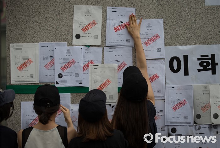 (서울=포커스뉴스) 미래라이프 대학 설립에 반대하는 이화여대 졸업생들 및 재학생들이 2일 오후 서울 서대문구 이화여자대학교 정문 앞에서 졸업장 반납 시위를 하고 있다.