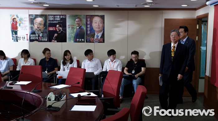 (서울=포커스뉴스) 김희옥 새누리당 혁신비상대책위원장과 정진석 원내대표가 4일 오전 서울 여의도 새누리당사에서 열린 혁신비상대책위원회의에 참석하기 위해 회의실로 들어서고 있다.