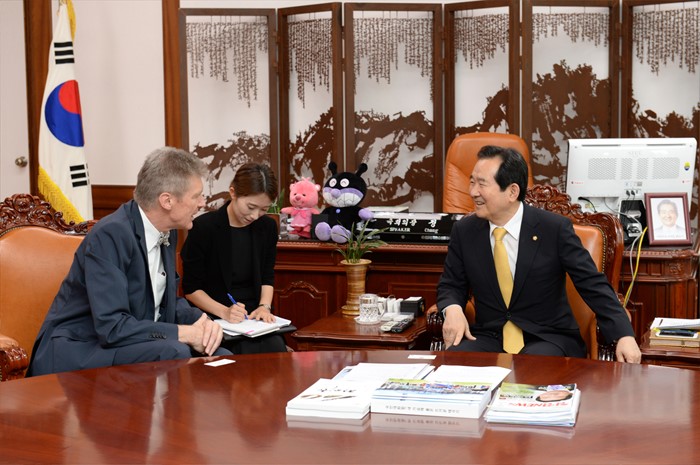 (서울=포커스뉴스) 정세균(오른쪽) 국회의장이 3일 오후 서울 여의도 국회를 방문한 게하르트 사바틸(Gerhard SABATHIL) 주한EU대사와 만나 면담을 하고 있다. <사진제공=국회>