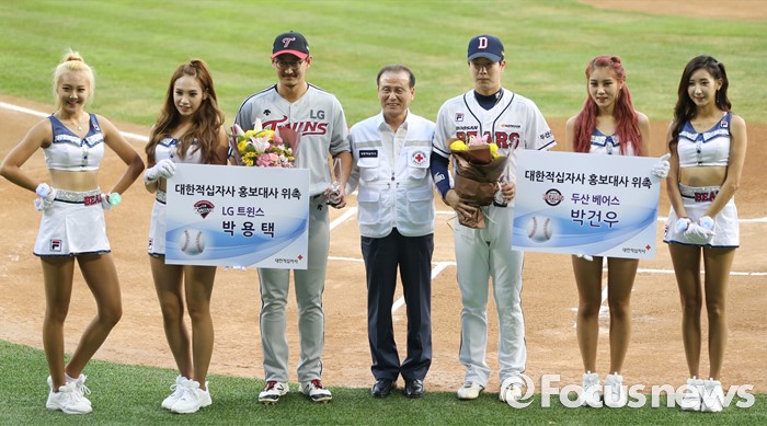 (서울=포커스뉴스) 3일 서울 잠실구장에서 열린 2016 프로야구 LG-두산 경기에 앞서 대한적십자사 홍보대사 위촉식을 갖고 강호권 대한적십자사 사무총장(가운데)이 LG트윈스 박용택, 두산베어스 박건우 선수에게 홍보대사 위촉패를 전달하고 기념사진을 찍고 있다.