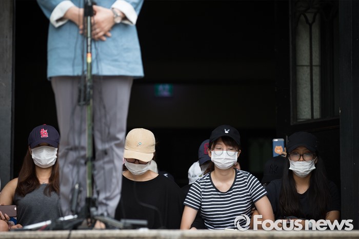 (서울=포커스뉴스) 최경희(앞) 이화여자대학교 총장이 3일 오후 서울 서대문구 이화여대 본관에서 평생교육 단과대학인 '미래라이프대학' 설립 중단 발표를 하고 있다. 최 총장 뒤로 점거농성 중인 이화여대 학생들의 지친 모습이 보이고 있다.