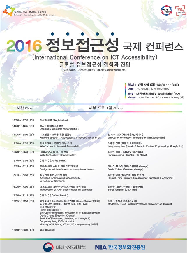 컨퍼런스에서는 사용자 인터페이스 접근성 그룹 의장이면서 접근성분야의 권위자인 캐나다 사스캐춘대(University of Saskachenwan) 짐 카터 교수의 기조연설을 시작으로, 이종영 구글 상무, 데니스 첸(Denis Chene) 프랑스텔레콤, 김현경 삼성전자 박사, 장성민 SK플래닛 팀장 등의 주제발표와 패널 토의로 진행된다.
