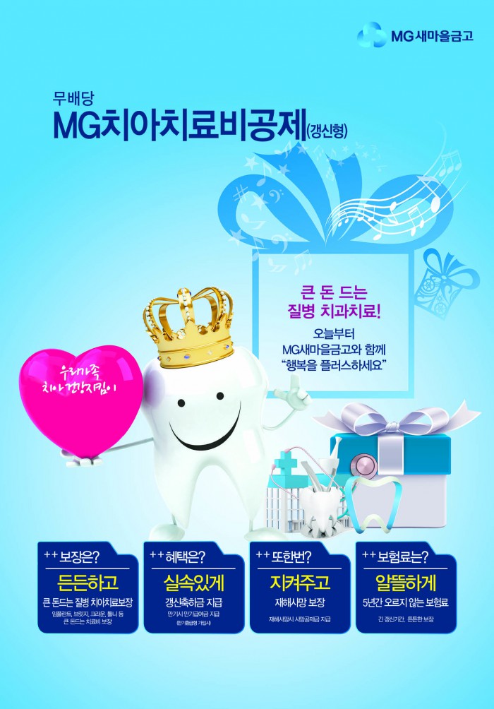 새마을금고 측은 "치과 치료비는 치아 한 개당 평균 57만원에 달할 정도로 경제적으로 큰 부담"이라며 "무배당 MG치아치료비공제를 통해 부담을 일부 줄일 수 있다"고 말했다.