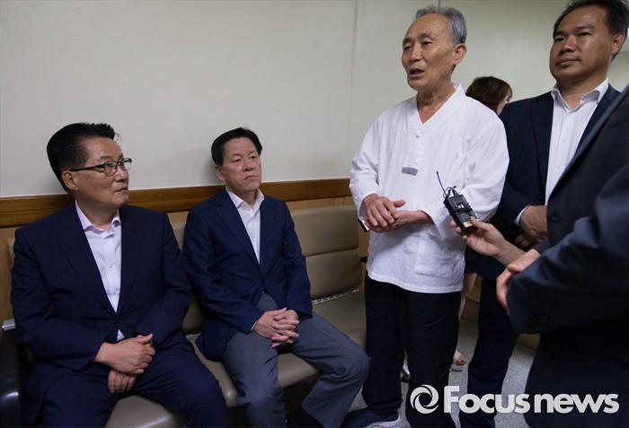 (서울=포커스뉴스) 박지원 국민의당 비상대책위원장과 의원들이 2일 종로구 서울대학교병원을 찾아 지난해 민중총궐기 당시 경찰의 물대포를 맞고 입원 중인 백남기 농민을 위로 방문한 뒤 정현찬 백남기대책위 공동대표의 설명을 듣고 있다. 왼쪽부터 박 비대위원장, 주승용 의원, 정 공동대표, 이용주 의원.