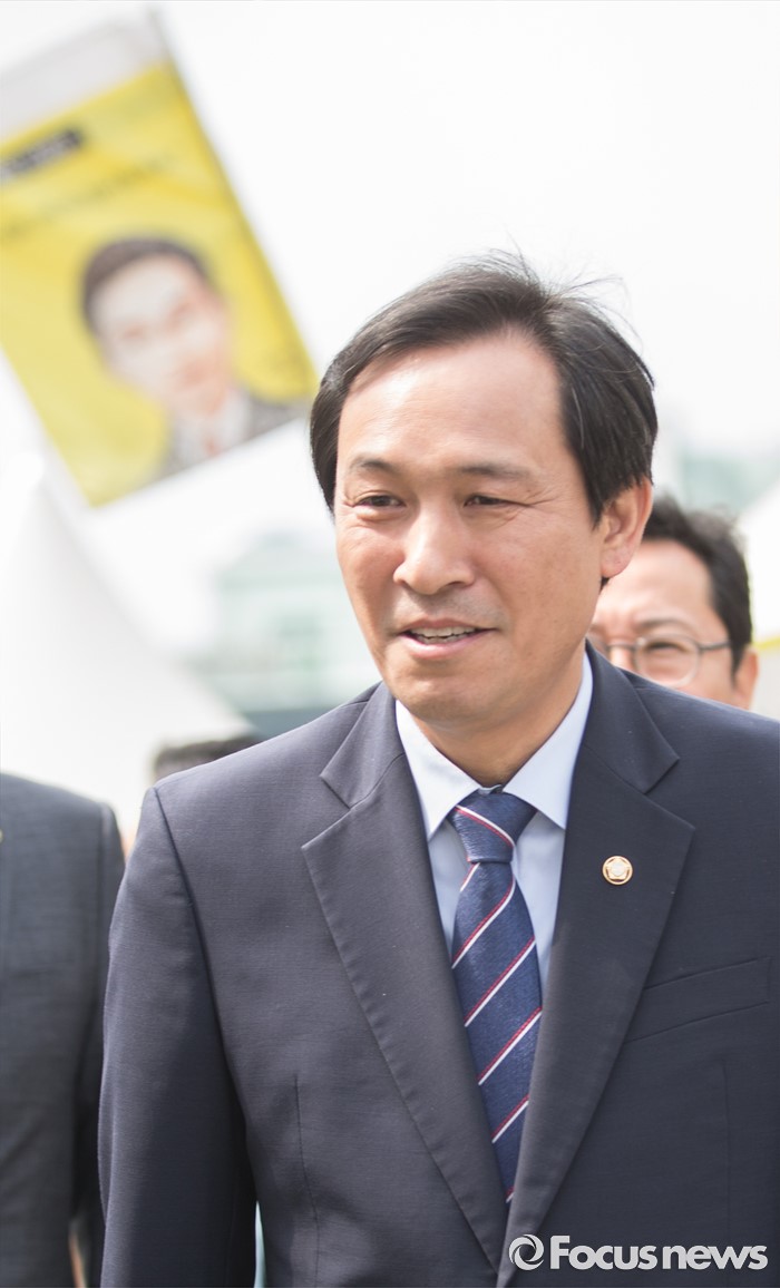 (서울=포커스뉴스) 1일 오전 서울 종로구 광화문 광장에 우상호 더불어민주당 원내대표가 이석태 세월호 참사 특별조사위원장의 단식농성장 격려방문을 위해 이동하고 있다.