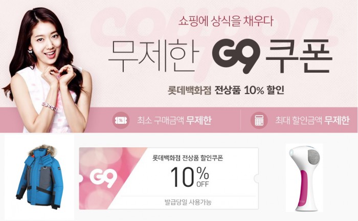 G9는 자사 사이트에서 선보이는 롯데백화점 전 브랜드상품에 10% 할인쿠폰을 제공한다. 이 할인 쿠폰은 최소 구매금액 및 최대 할인금액 제한이 없어 다운점퍼 등 고가 역시즌 제품이나 패션·뷰티상품에 활용하면 큰 할인혜택을 얻을 수 있다.