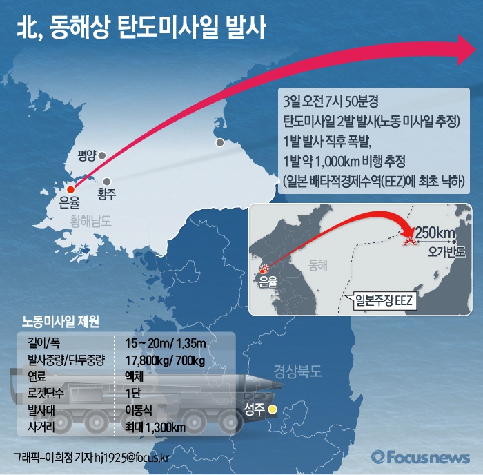 (서울=포커스뉴스) 북한이 3일 오전 7시50분쯤 황해남도 은율 일대에서 동해로 노동미사일로 추정되는 탄도미사일 2발을 발사했다. 2발 중 1발은 발사 직후 폭발했으며 1발은 약 1000km가량 비행해 일본 아키타(秋田)현 오가(男鹿)반도 서쪽 250㎞ 지점의 배타적 경제수역(EEZ)에 낙하한 것으로 분석됐다. 북한 탄도미사일이 일본의 EEZ에 낙하한 것은 이번이 처음이다.