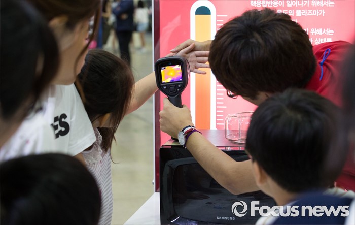 (서울=포커스뉴스) 4일 오전 서울 강남구 코엑스에서 열린 '제20회 대한민국 과학창의축전'을 찾은 시민들이 열감지 카메라로 손 온도를 측정하고 있다.