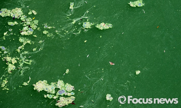 (청주=포커스뉴스) 폭염이 이어지면서 대청호 수역에 조류경보 '관심' 단계가 내려진 가운데 4일 오후 충북 청주시 상당구 문의대교 인근 대청호에 녹조가 형성돼 있다.