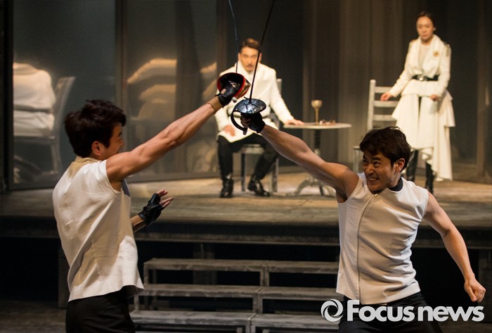 (서울=포커스뉴스) 4일 오후 서울 중구 충무아트센터에서 열린 연극 '햄릿-더 플레이' 언론시연회에 참석한 배우 김강우(왼쪽), 김지휘가 열연하고 있다.