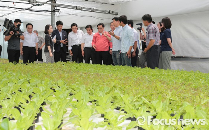 (진천=포커스뉴스) 이동필 농림축산식품부 장관이 4일 충북 진천군 '만나 CEA' 농업회사법인을 찾아 ICT와 바이오기술을 결합한 식물공장 채소류 재배시설 등 스마트 팜 확산 사례를 현장 점검하고 있다. <사진제공=농림축산식품부>