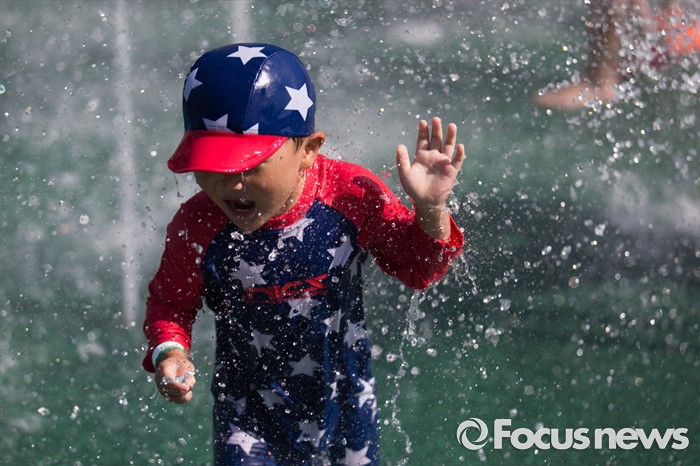 (서울=포커스뉴스) 서울에 첫 폭염경보가 내려진 4일 오후 서울 서초구 양재시민의숲 내 양재천 수영장을 한 아이가 물놀이를 하고 있다.