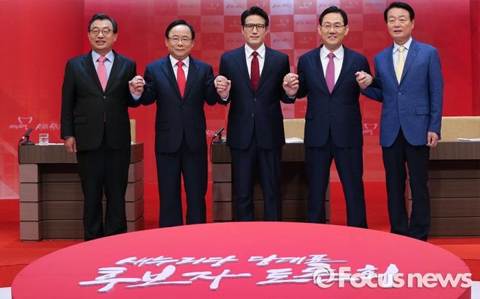 (서울=포커스뉴스) 4일 오후 서울 강서구 등촌동 SBS공개홀에서 새누리당 대표 경선 4차 TV토론회을 마친 의원들이 포즈를 취하고 있다. 오른쪽부터 한선교, 주호영, 정병국, 이주영, 이정현 의원.