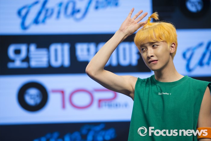 (서울=포커스뉴스) 4일 오후 서울 강남구 일지아트홀에서 열린 아이돌 그룹 업텐션의 미니앨범 'Summer go'발표 쇼케이스에 참석한 멤버 샤오가 포토타임을 갖고 있다.