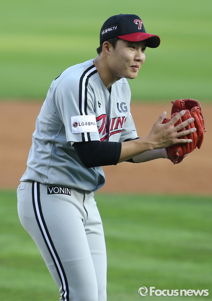 (서울=포커스뉴스) 4일 서울 잠실구장에서 열린 2016 프로야구 LG-두산 경기에서 1회말 LG 투수 임찬규가 자신의 투구에 맞고 진루한 두산 박건우에게 사과하고 있다.