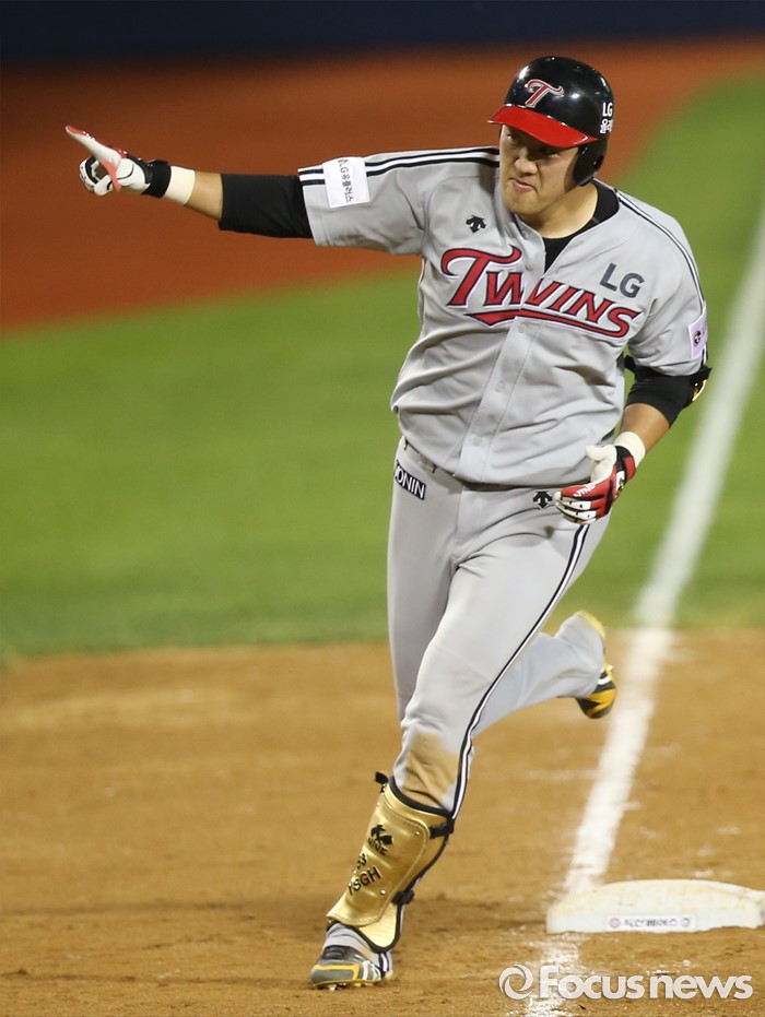 (서울=포커스뉴스) 4일 서울 잠실구장에서 열린 2016 프로야구 LG-두산 경기 8회초 1사후 LG 양석환이 중월 솔로 홈런을 치고 더그아웃을 가리키며 3루를 돌고 있다.