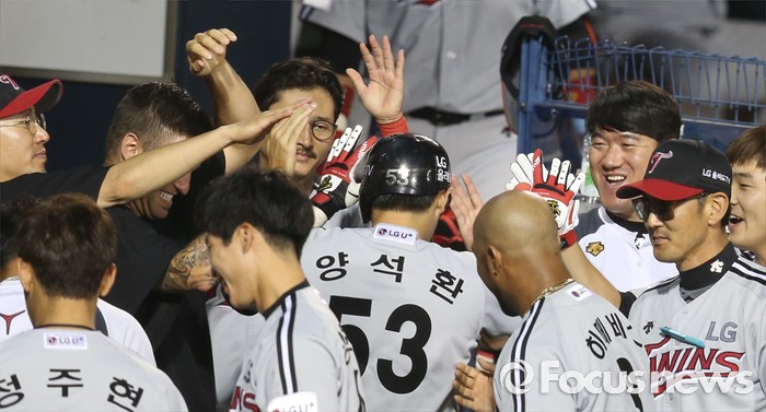 (서울=포커스뉴스) 4일 서울 잠실구장에서 열린 2016 프로야구 LG-두산 경기 8회초 1사후 LG 양석환이 중월 솔로 홈런을 치고 더그아웃에서 동료들의 열렬한 환영을 받고 있다.