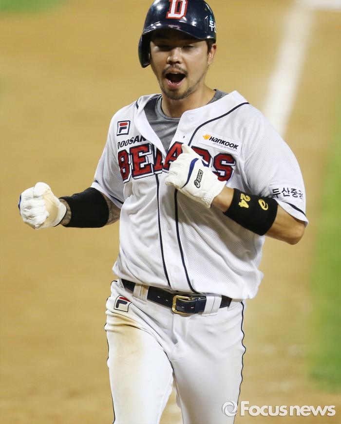 (서울=포커스뉴스) 4일 서울 잠실구장에서 열린 2016 프로야구 LG-두산 경기 연장 10회말 1사 1,3루에서 두산 3루주자 오재원이 LG 투수 임정우의 폭투로 홈인하며 환호하고 있다.