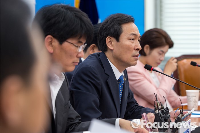 (서울=포커스뉴스) 우상호 더불어민주당 원내대표가 5일 오전 서울 여의도 국회에서 열린 상임위원회 간사단 간담회에 참석해 모두발언 하고 있다.
