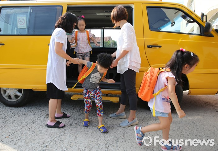 (세종=포커스뉴스) 5일 오전 세종시 금남면 금남어린이집에서 원생들이 통학차량을 이용해 등원하고 있다. 이날 정진엽 보건복지부장관은 유치원 통학차량 안전 점검을 실시했다.
