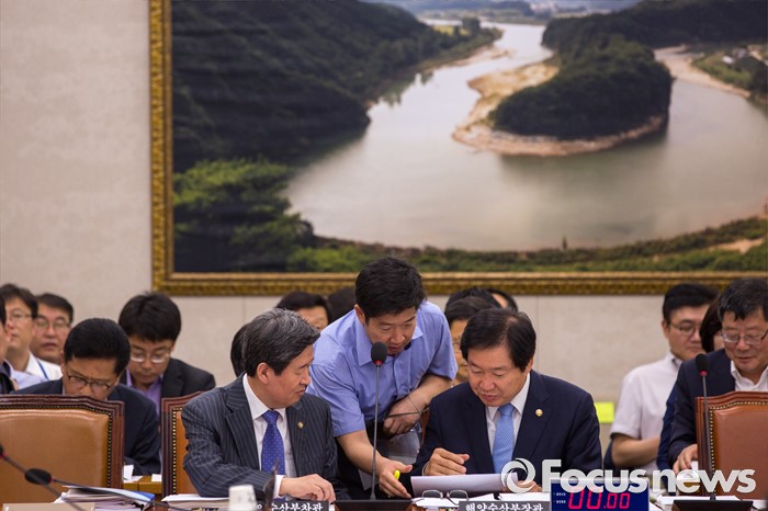 (서울=포커스뉴스) 김영석(오른쪽) 해양수산부 장관과 윤학배(왼쪽) 차관이 5일 오전 서울 여의도 국회에서 열린 국회 농림축산식품해양수산위원회 전체회의에 참석해 회의시작 전 해수부 관계자와 대화하고 있다.