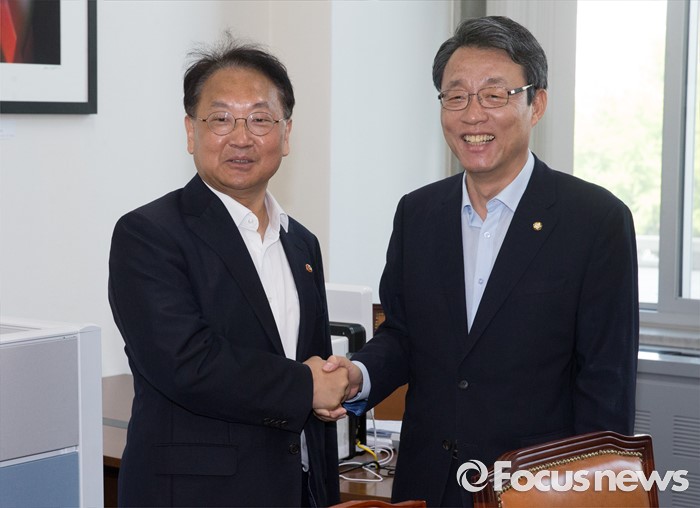 (서울=포커스뉴스) 5일 오전 서울 여의도 국회에서 추경 예산 등 협조를 위해 방문한 유일호(왼쪽) 경제부총리 겸 기획재정부 장관이 김성식 국민의당 정책위의장과 만나 인사하고 있다.