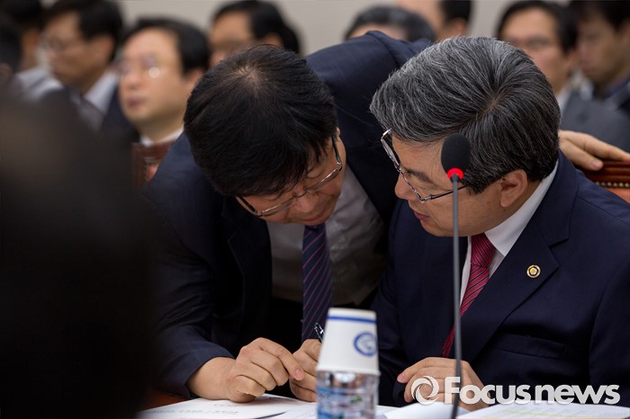 (서울=포커스뉴스) 주영섭(오른쪽) 중소기업청장이 5일 오전 서울 여의도 국회에서 열린 산업통상자원위원회 전체회의에 참석해 회의주비 하고 있다.