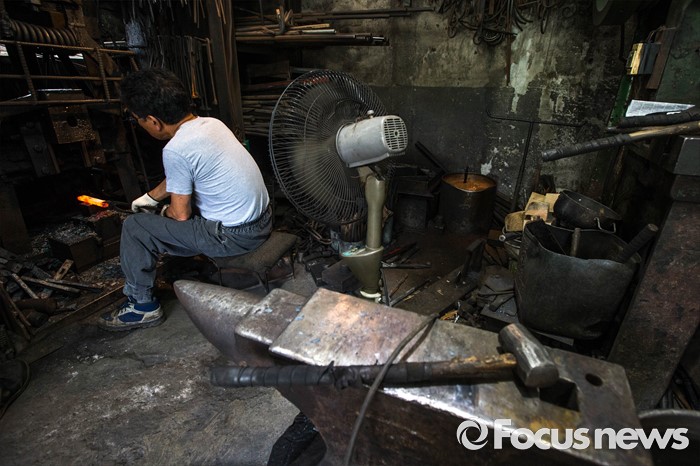 (서울=포커스뉴스) 서울이 낮 최고 36도를 기록하는 등 전국적으로 불볕더위가 기승을 부리는 5일 오전 서울 은평구 수색동에 위치한 형제대장간에서 류상준(63)씨가 화덕 앞에서 건설용 공구를 만드는 작업을 하고 있다.