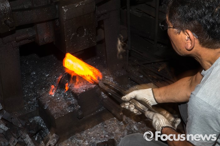 (서울=포커스뉴스) 서울이 낮 최고 36도를 기록하는 등 전국적으로 불볕더위가 기승을 부리는 5일 오전 서울 은평구 수색동에 위치한 형제대장간에서 류상준(63)씨가 화덕 앞에서 건설용 공구를 만드는 작업을 하고 있다.