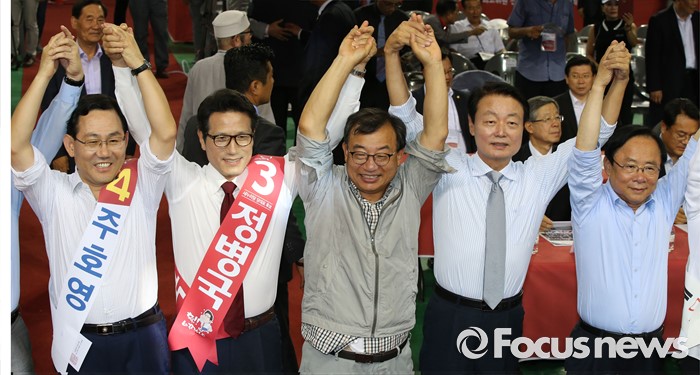 (천안=포커스뉴스) 5일 오후 충남 천안시 유관순체육관에서 열린 새누리당 대표 및 최고위원 선출 충청권 합동연설회에서 당대표에 출마한 주호영(왼쪽부터), 정병국, 이정현, 한선교, 이주영 후보가 손을 들어 당원들에게 인사하고 있다.