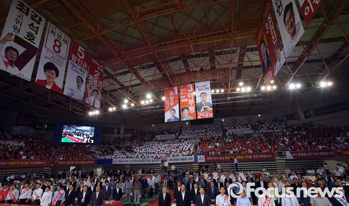 (천안=포커스뉴스) 5일 오후 충남 천안시 유관순체육관에서 열린 새누리당 대표 및 최고위원 선출 충청권 합동연설회에서 후보들과 당직자들이 애국가를 부르고 있다.