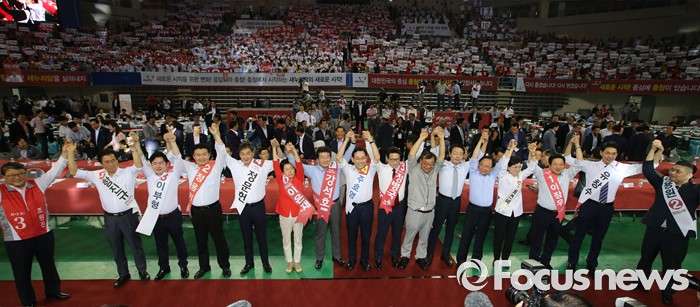 (천안=포커스뉴스) 5일 오후 충남 천안시 유관순체육관에서 열린 새누리당 대표 및 최고위원 선출 충청권 합동연설회에서 당대표 및 최고위원에 출마한 후보들이 당원들에게 인사하고 있다.