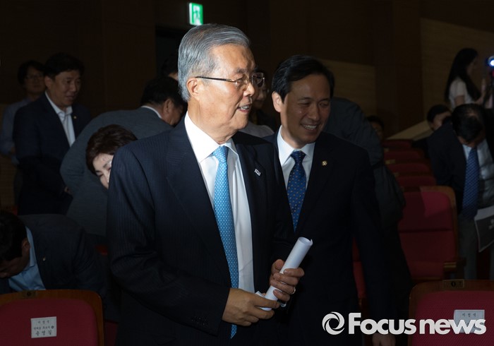 (서울=포커스뉴스) 5일 오후 서울 여의도 국회 의원회관에서 열린 더불어민주당 당대표 선출을 위한 예비경선대회에 김종인(왼쪽) 비대위 대표와 우상호 원내대표가 참석하고 있다.