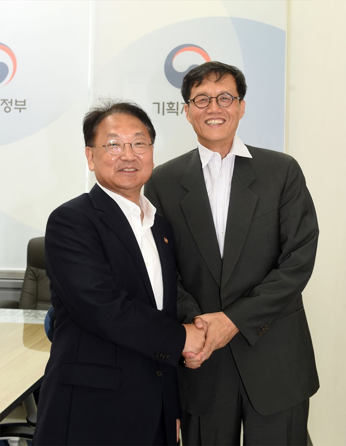 (서울=포커스뉴스) 유일호(왼쪽) 부총리 겸 기획재정부 장관이 5일 서울 여의도 국회에서 이창용 IMF 아.태 국장과 면담에 기념촬영 하고 있다. <사진제공=기획재정부>