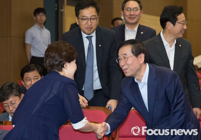(서울=포커스뉴스) 5일 오후 서울 여의도 국회 의원회관에서 열린 더불어민주당 당대표 선출을 위한 예비경선대회에 참석한 박원순 서울시장이 의원들과 인사하고 있다.