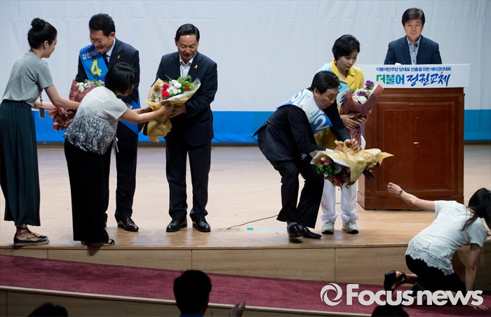 (서울=포커스뉴스) 5일 오후 서울 여의도 국회 의원회관에서 더불어민주당 당대표 선출을 위한 예비경선대회에 참석한 한 당직자가 이종걸 당대표 후보에게 꽃다발을 전해주던 중 넘어지고 있다. 왼쪽부터 송영길, 김상곤, 이종걸, 추미애 당대표 후보. 이날 예비경선에서는 송영길 후보가 탈락했다.