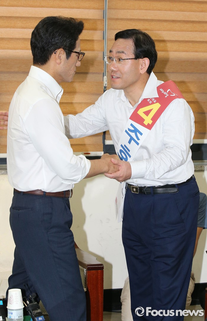 (천안=포커스뉴스) 새누리당 전당대회를 4일 앞두고 5일 오후 충남 천안 유관순체육관에서 충청권 합동연설회를 마치고 비박계 당권주자들의 2차 단일화에서 주호영 후보가 단일 후보로 결정 됐다. 정병국 후보와 주호영 후보가 악수를 하고 있다.