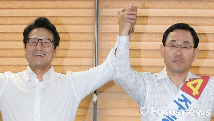 (천안=포커스뉴스) 새누리당 전당대회를 4일 앞두고 5일 오후 충남 천안 유관순체육관에서 충청권 합동연설회를 마치고 비박계 당권주자들의 2차 단일화에서 주호영 후보가 단일 후보로 결정 됐다. 정병국 후보와 주호영(오른쪽) 후보가 손을 잡고 들어보이고 있다.
