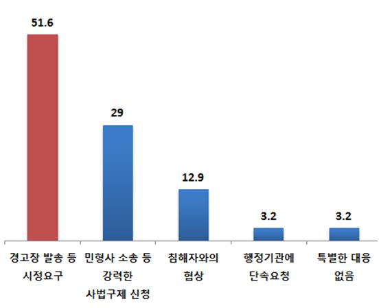 분쟁을 경험한 기업은 "경고장 발송 등 시정요구로 대응했다"는 응답이 51.6%로 가장 많았다. "민·형사 소송 등 강력한 사법구제 신청으로 대응했다"는 기업은 29.0%로 그 뒤를 이었다.