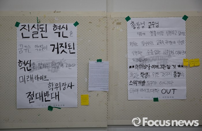(서울=포커스뉴스) 5일 오후 서울 서대문구 이화여대 교내에 최경희 이화여대 총장의 미래라이프 단과대학 설립 추진을 규탄하는 대자보가 부착돼 있다. 이날 최경희 이화여대 총장은 대학 본관 점거농성 중 교수·교직원 감금 혐의를 받고 있는 학생들의 처벌을 원치 않는다며 탄원서를 경찰에 제출했고 농성 중인 이화여대 학생들은 “이중적 행동”이라며 최 총장의 사퇴를 거듭 촉구했다.