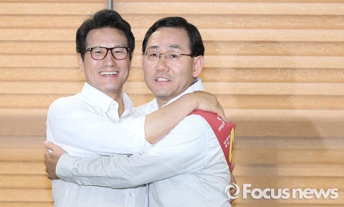 (천안=포커스뉴스) 새누리당 전당대회를 4일 앞두고 5일 오후 충남 천안 유관순체육관에서 충청권 합동연설회를 마치고 비박계 당권주자들의 2차 단일화에서 주호영(오른쪽) 후보가 단일 후보로 결정 됐다. 정병국 후보와 주호영 후보가 포옹하고 있다.