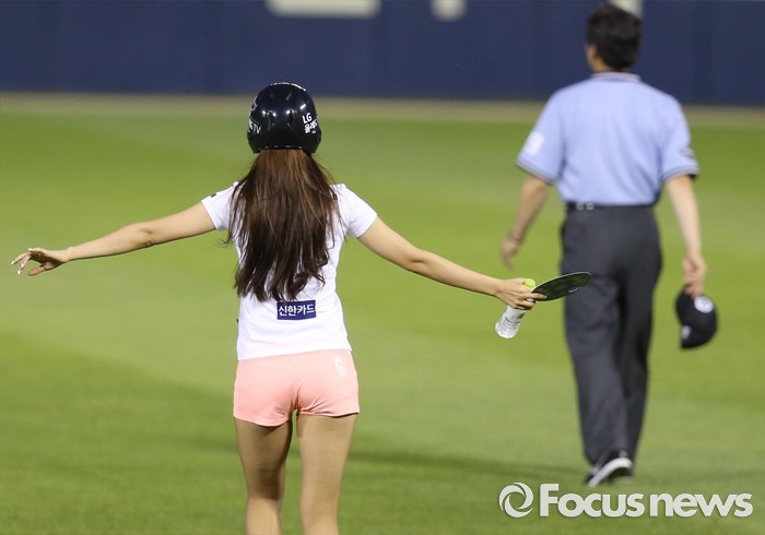 (서울=포커스뉴스) 5일 서울 잠실구장에서 열린 2016 프로야구 kt-LG 경기 4회초가 끝난후 배트걸이 강광회 1루심에게 시원한 생수를 전달하러 쫓아가고 있다. 아는지 모르는지 강 심판은 자꾸만 외야로 가고 있다.